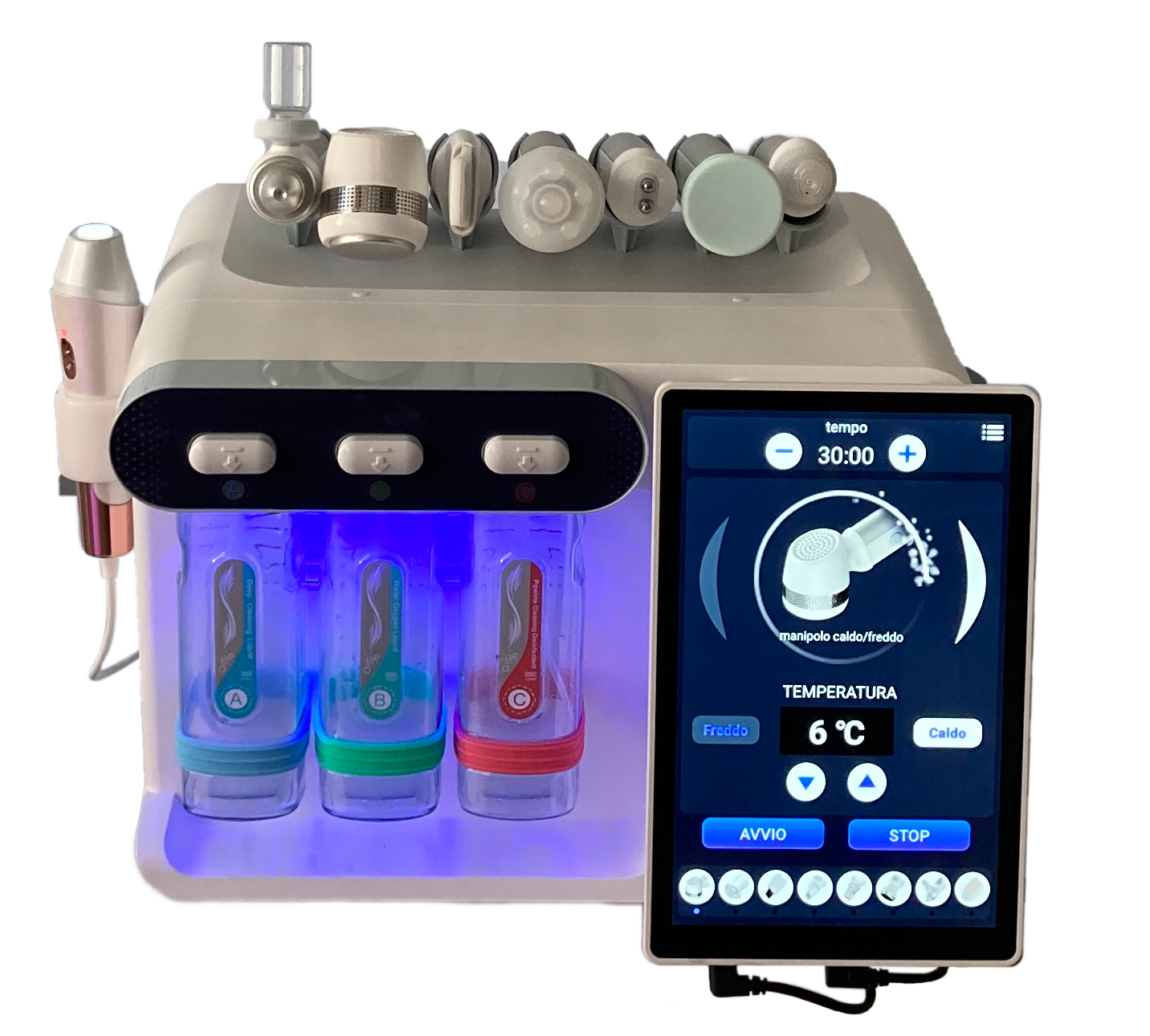 Sistema multifunzionale con diagnostica cutanea, idropeeling e trattamenti personalizzati per migliorare la pelle.